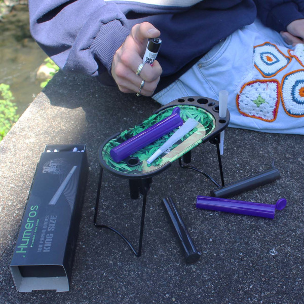 For the ultimate stoner convenience: With the Cone Set Box by Black Leaf, you get everything you need for an uncomplicated and relaxing smoking experience. From quickly filling the cones to lighting up with a stylish lighter – this set makes rolling a breeze.✔️ 1 x Black Leaf 'El Humero' Cones: Pre-rolled, conical cones with filters that are easy to fill – perfect for those who like things trouble-free. The paper burns slowly and ensures an even smoking experience.✔️ 1 x Black Leaf Rolling Console: The practical tray specifically made for filling cones. You can fill two cones at once and also use the tray for rolling joints. A handy workspace at the perfect coffee table height!✔️ 4 x Joint Tubes 117mm (2 x purple, 2 x black): Conical joint tubes with practical plastic caps. Perfect for the stoner on the go.✔️ 1 x CLIPPER Lighter: Iconic lighter with a surprise design, not only stylish but also functional.With the Cone Set Box, you have everything you need for a relaxed and perfect rolling experience – fast, easy, and convenient. And don’t forget: those who roll, hit first