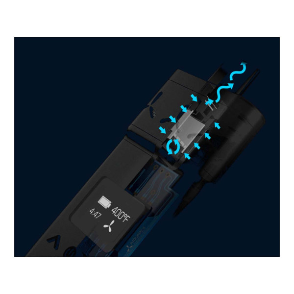 The large colour display shows all the necessary functions: battery capacity, temperature in Celsius or Fahrenheit, the time until the appliance switches off automatically and the heating process itself. Three buttons below the display ensure easy operation with just one hand.