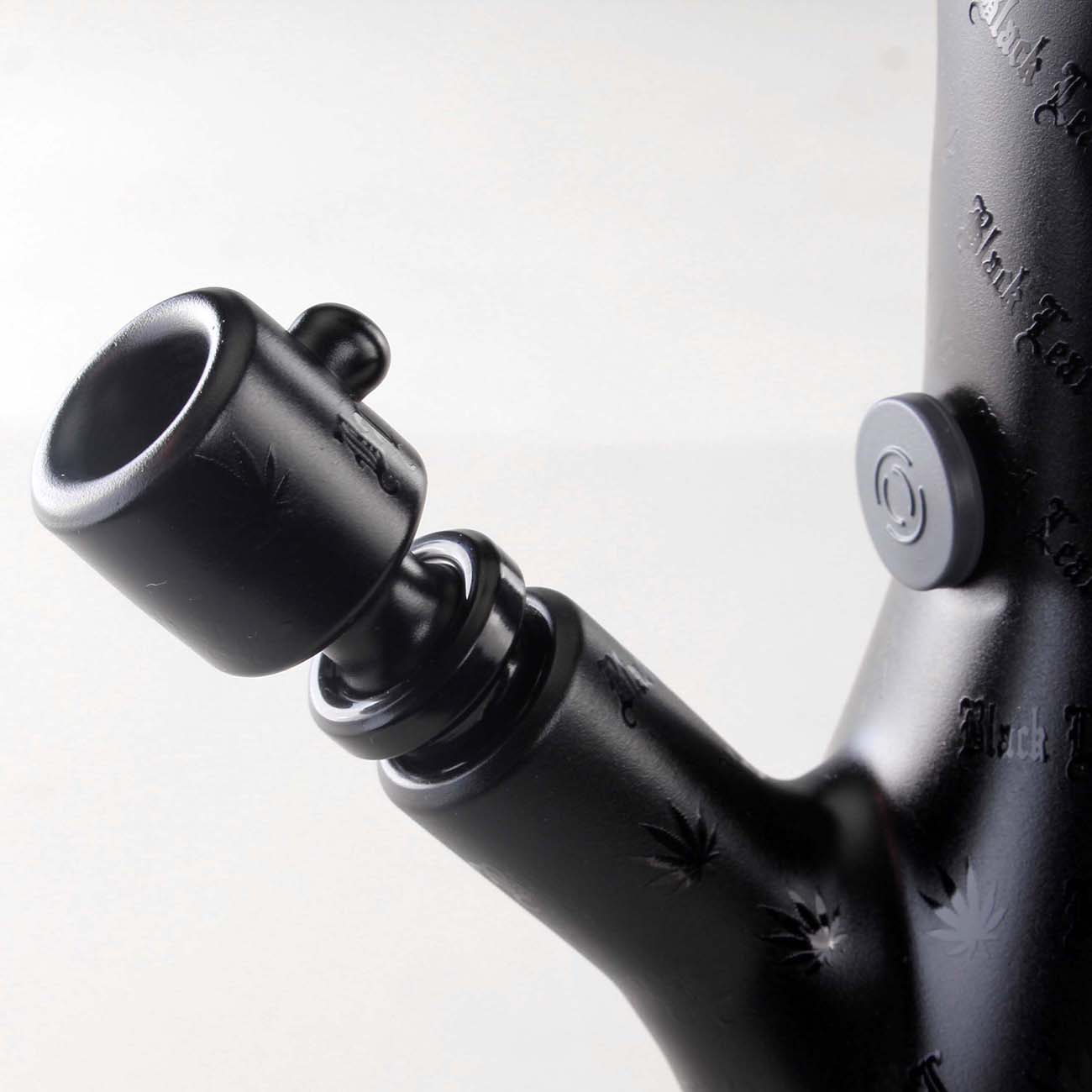 Back to Black! Black Leaf® totally: completely black ice bong in beaker shape made of black borosilicate glass, including black slit diffuser chillum and black herb bowl. The black, silky-glossy base is decorated with small, high-gloss cannabis leaves and Black Leaf® lettering and the BL logo.