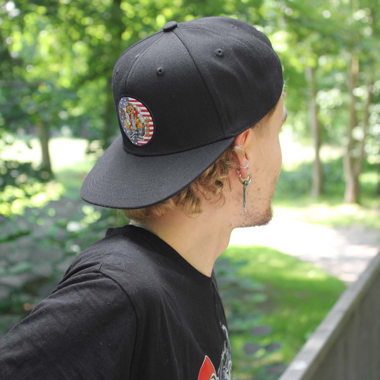 Stylish cap from Black Leaf® with a cool Black Leaf® motif, namely Teddy Blaze from Cannifornia (by Sly art) which is embroidered. The snapback, i.e. the snap fastener made of sturdy plastic, allows the cap to be adjusted to any head size.