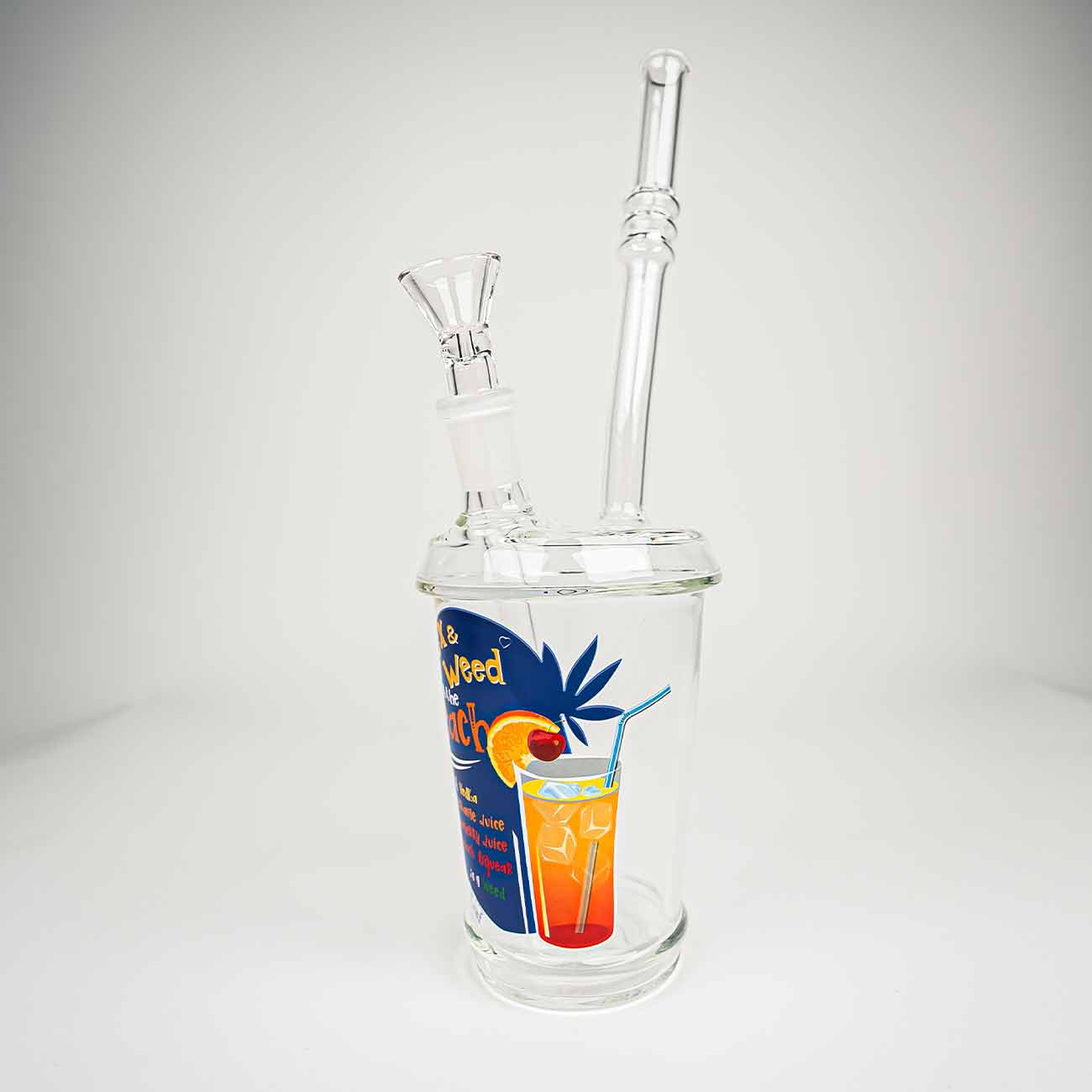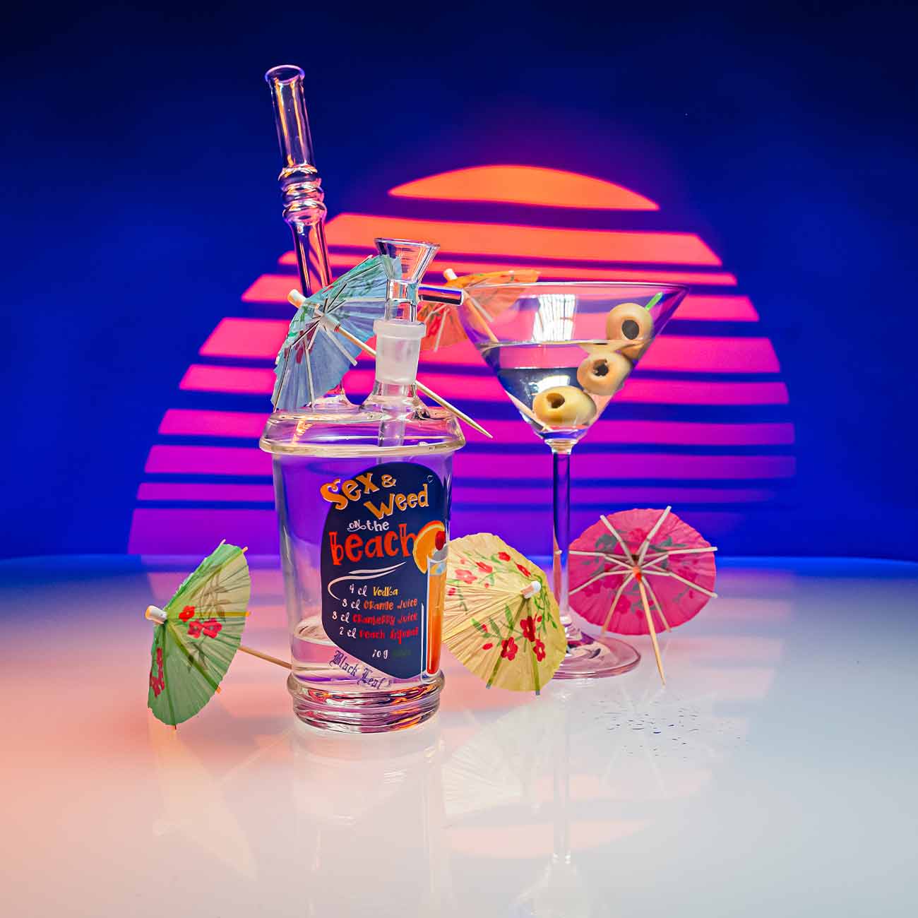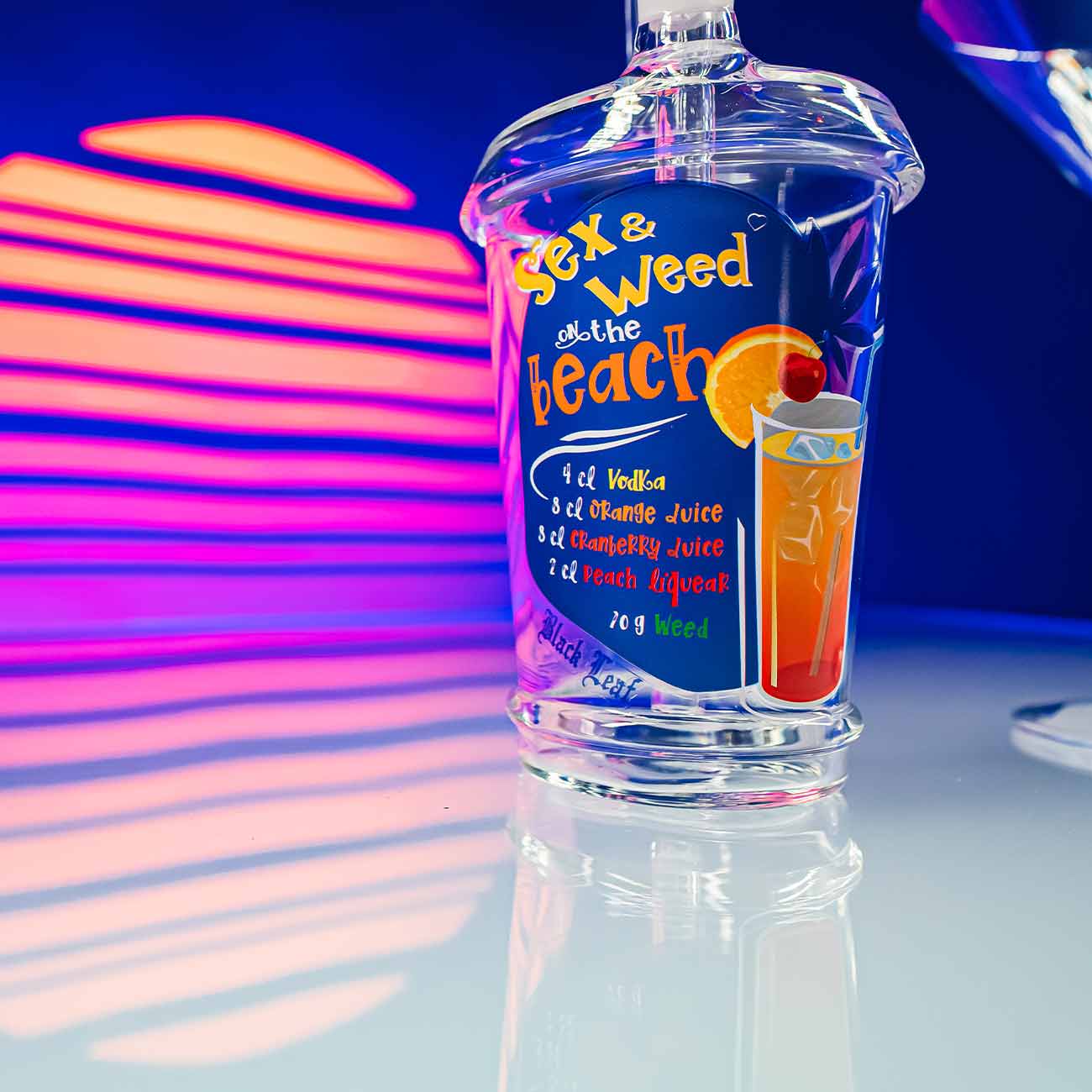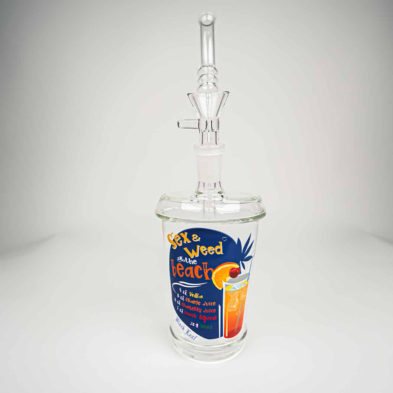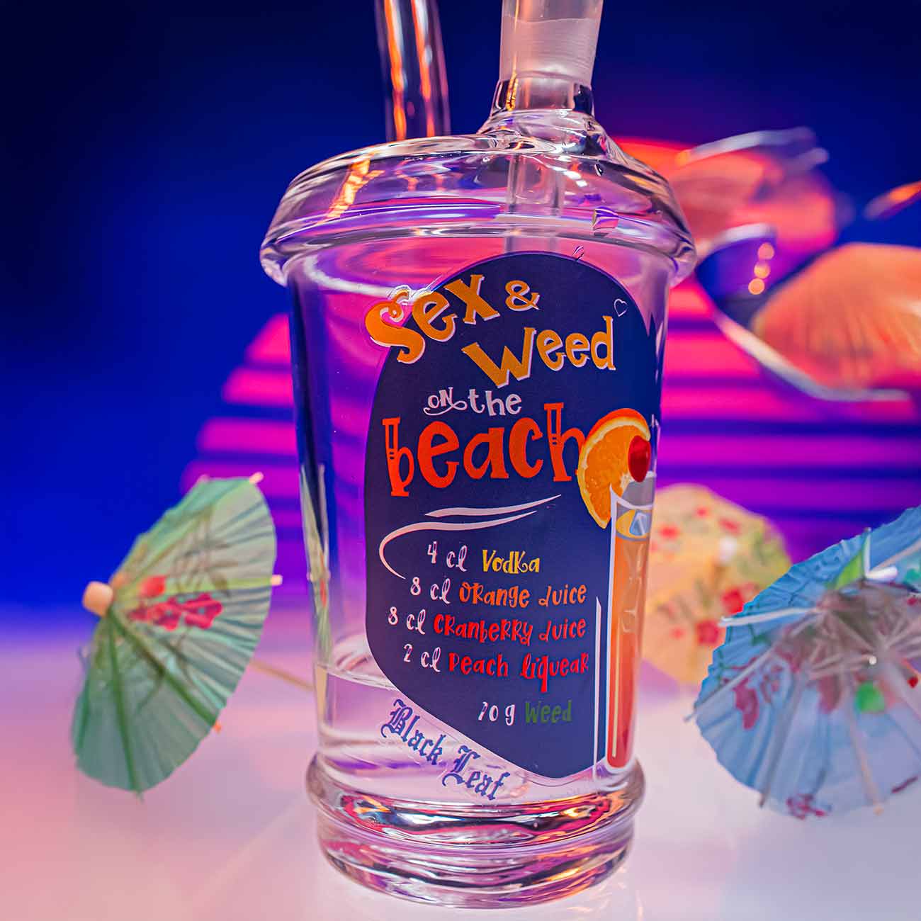 We open the beach season with a SEX & WEED ON THE BEACH by Black Leaf® (the recipe is written on the glass mug). What, no beach in sight? Then simply smoke the last ingredient of the recipe in this cool borosilicate glass jar bong, and dream of the beach! And the other thing is also possible without a beach...