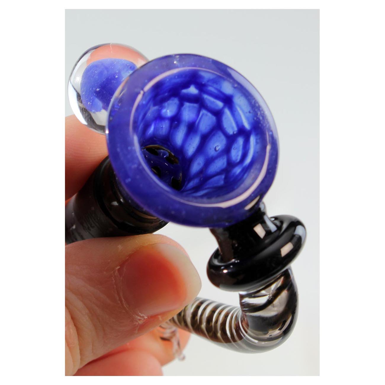Remarkably beautiful, artfully handmade herb bowl from 'Black Leaf' made of multicoloured borosilicate glass and a fascinating black standard grinding. A screen is already integrated. In addition, the glass bowl has a handle and a roll stopper in the form of a glass ball containing a cute mushroom.