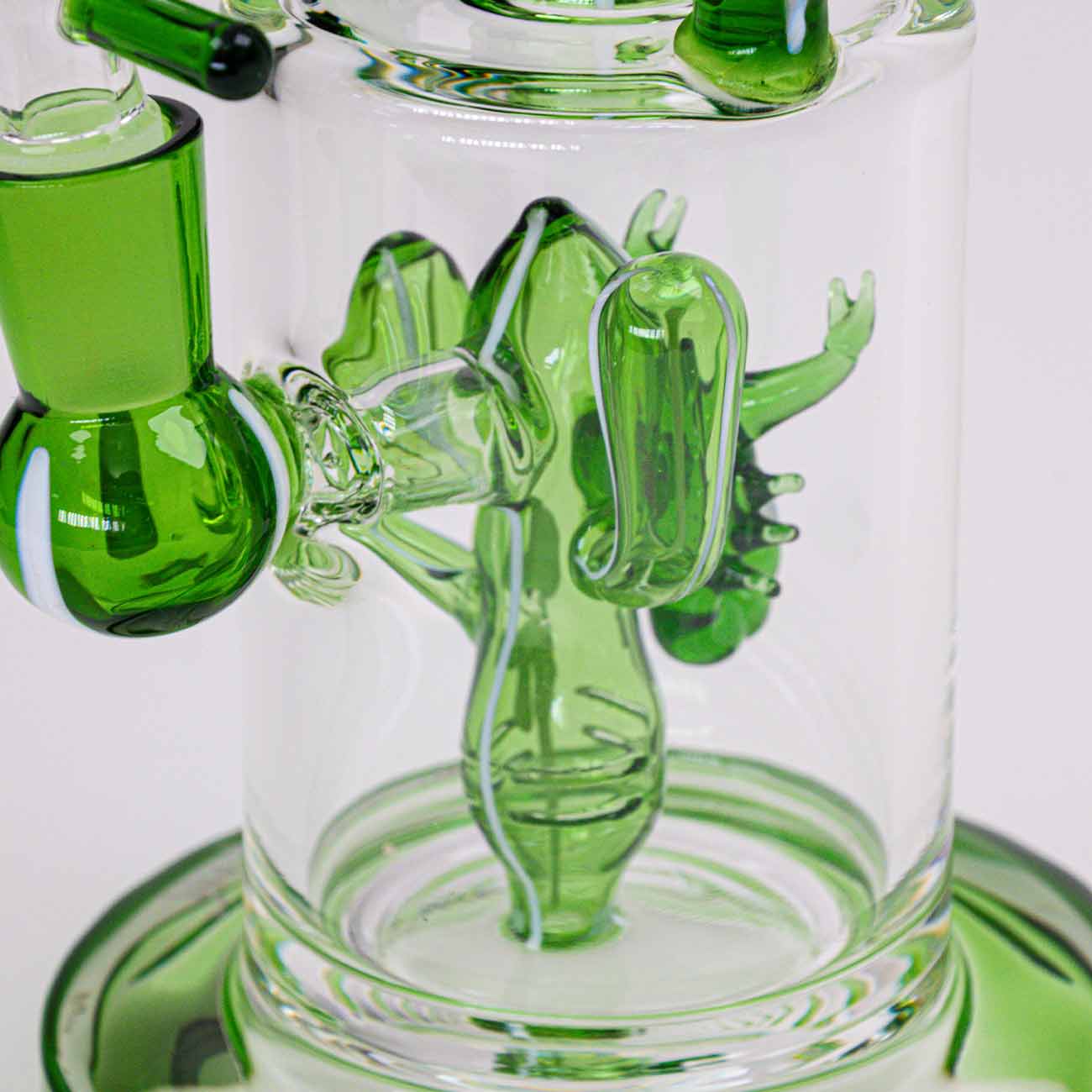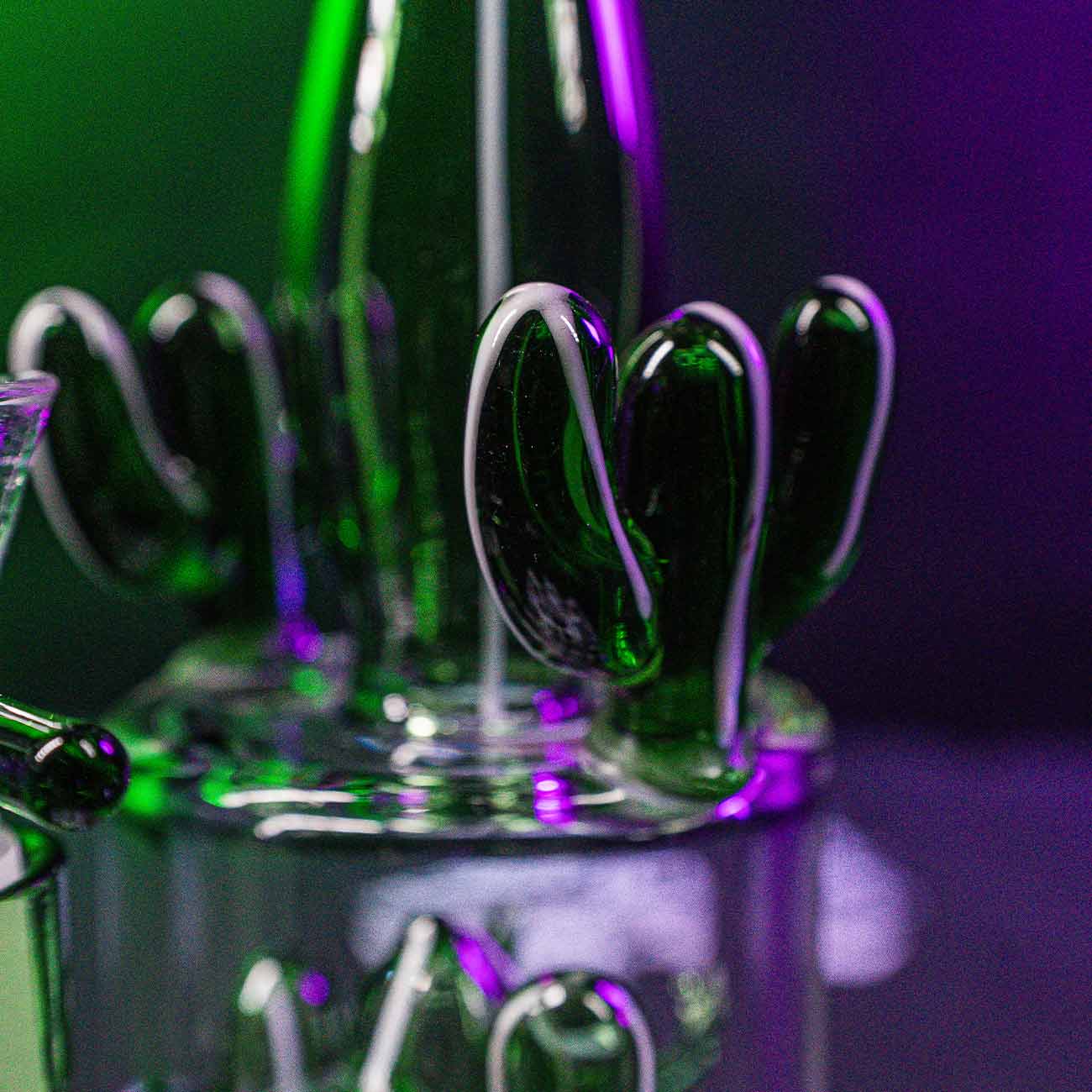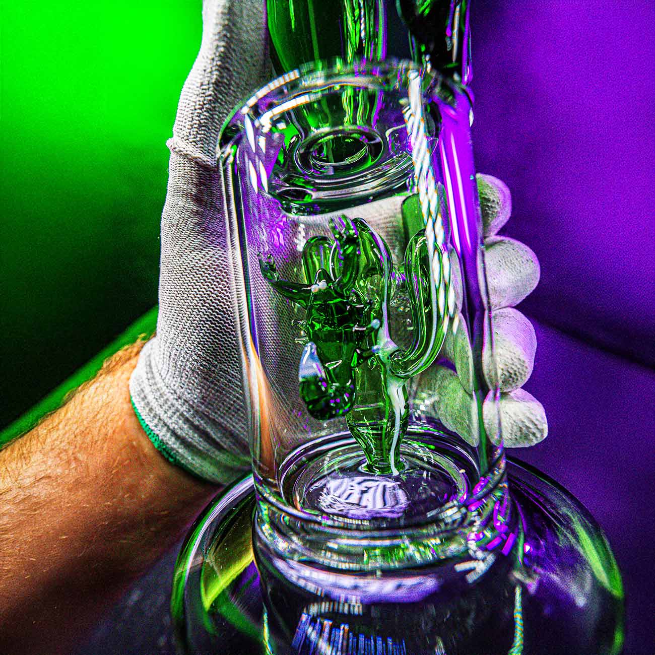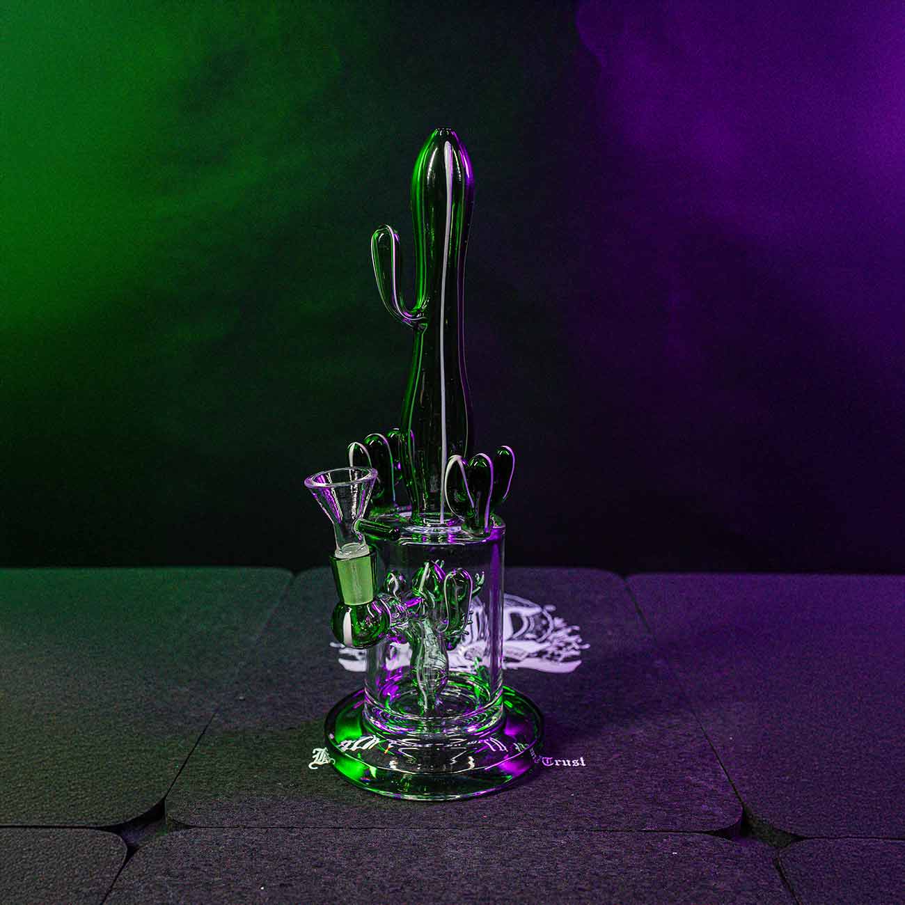 However, the cactus in the water chamber is not just decoration, but a slit diffuser that causes the bong water to bubble vigorously. The water and air turbulence filters and cools the smoke, keeping the ‘cough afterwards’ to a minimum.