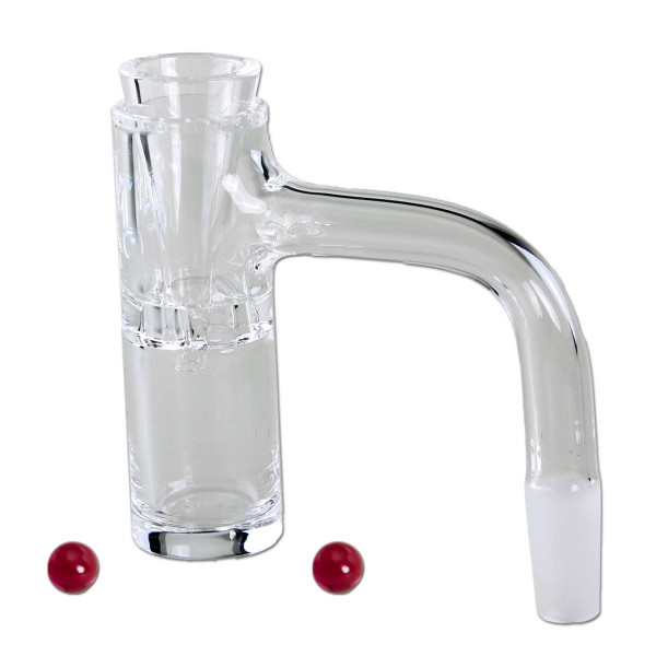 This interesting banger set from Black Leaf® brings a breath of fresh air to dabbing accessories. The so-called Globstopper Banger is narrowed in the centre so that the enclosed funnel, called Terp Titty, can be inserted. Before inserting it, you first put the two dab beads into the banger and heat it up. The Terp Titty is then inserted. The extract is then poured in and dripped into the banger. When it starts to vaporize, start inhaling. The dab pearls start to rotate vigorously, which strongly supports the vaporization of the dripping extract. The result is a particularly even, efficient smoke development with dense, very potent vapour!