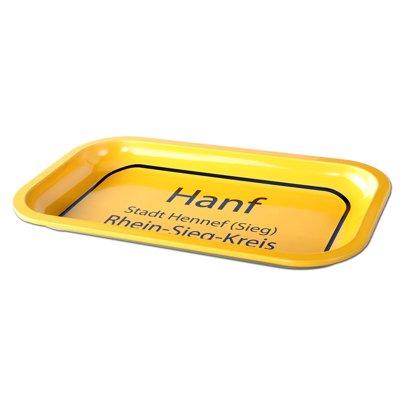 Funny rolling tray by Black Leaf® showing one of the most frequently stolen place-name signs in Germany: HANF (Hemp)! Which, to everyone’s delight, is our neighbouring village.