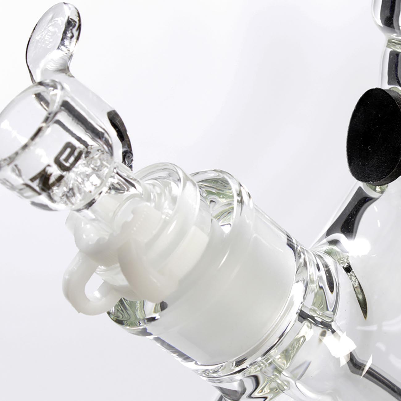 The flower and herbal bowl has practically an integrated screen. The bowl can be easily pulled out by the finger-friendly handle which is simultaneously a reliable roll-off protection. A bong clip made of plastic ensures a stable connection between the bowl and the chillum which also ensures air and water swirls through diffuser slots.