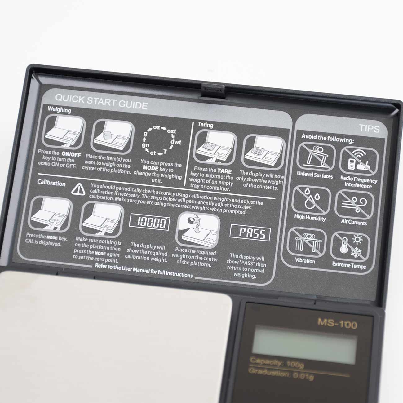 The BLscale Digital Scale black has a quick user guide inside the lid which is fixed to the housing and a scale platform made of stainless steel. With CE-sign.