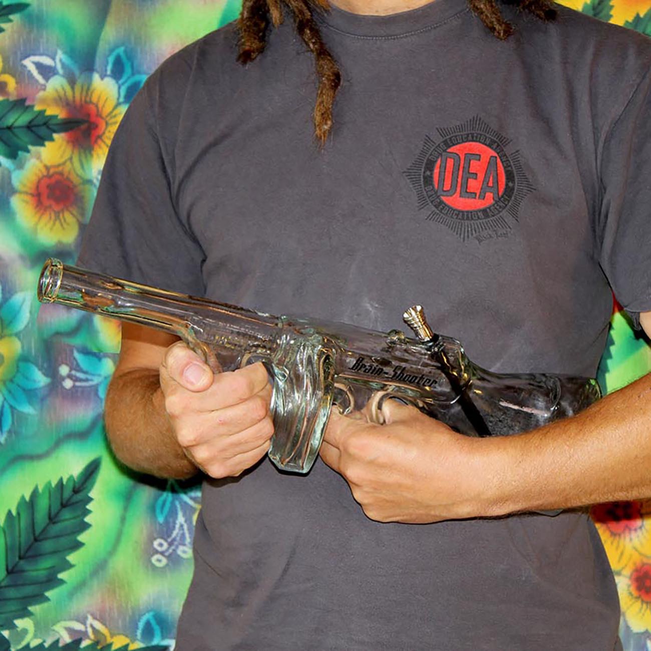 Brain-Shooter machine gun with kick hole. THE Party Hit! This bong is a guaranteed to be a massive hit at any party! These extremely tall machine-gun bongs with have a metal-chillum and slip-bowl and are sure to pacify even the hardest gun lover.
