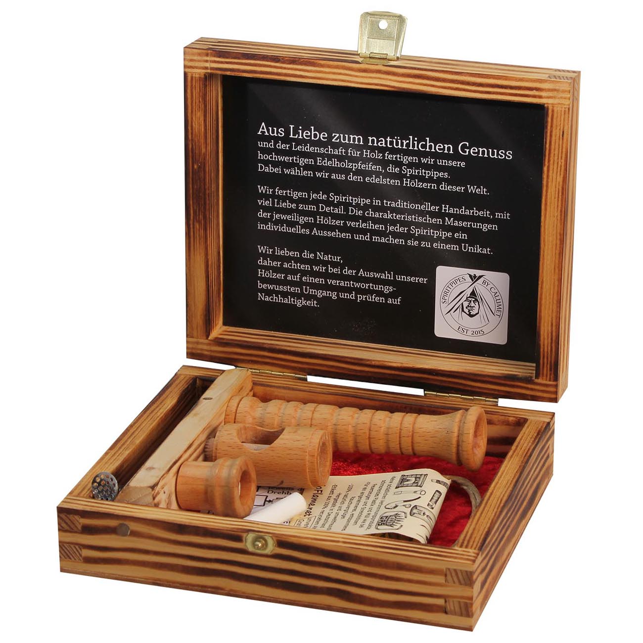 The luxury pure pipe is packed in a beautiful wooden storage box with integrated and very practical pipe holder. On the lid of the 'treasure chest' is printed the cool 'Calumet' logo. Accessories like a screen of 'Black Leaf', an 'actiTube' activated carbon filter and a natural fuse made of beeswax from 'BioFlame' are on top. The deluxe pipe from 'Calumet' is THE highlight for every connoisseur of natural consumption.