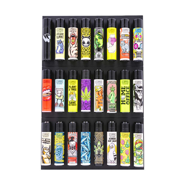 You can decide for yourself whether you want to place the great black fire-board on the shelf, attach it to the fridge with the magnetic strip or hang it directly on the wall, because anything is possible. In any case, you can give your favourite clippers the perfect setting for a stylish appearance. Available in two sizes (either for 8 or 24 Clipper® lighters).