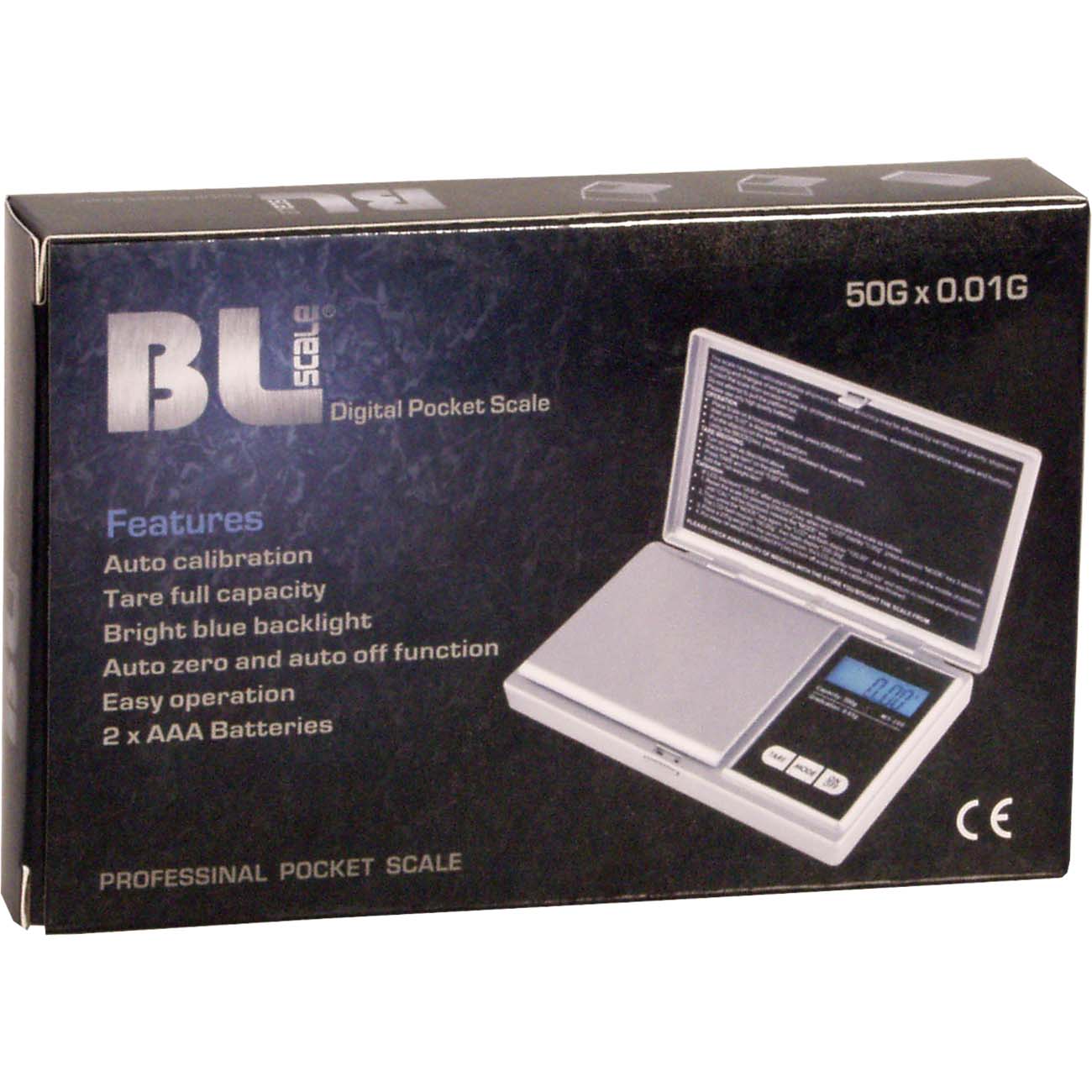 This silver BLscale digital-scale has a blue backlit LCD display and has full Tare and Calibration function. With a weighing range of 0.01g - 50g and an accuracy of n 0.01g. It is powered by : 2x AAA batteries (included).