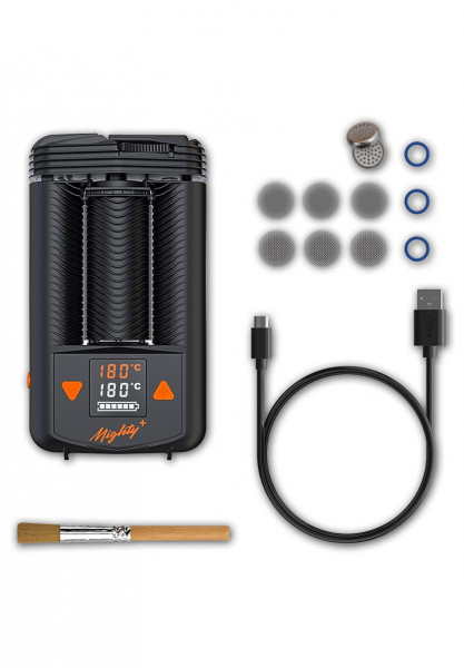 1pc 'Mighty+' vaporizer 1pc USB-C cable (USB-type C on USB-type A plug) 3pcs bottom sealing ring small 3pcs normal screen small 3pcs coarse screen small 1pc dosing capsule 1pc cleaning brush 1pc quick-manual
