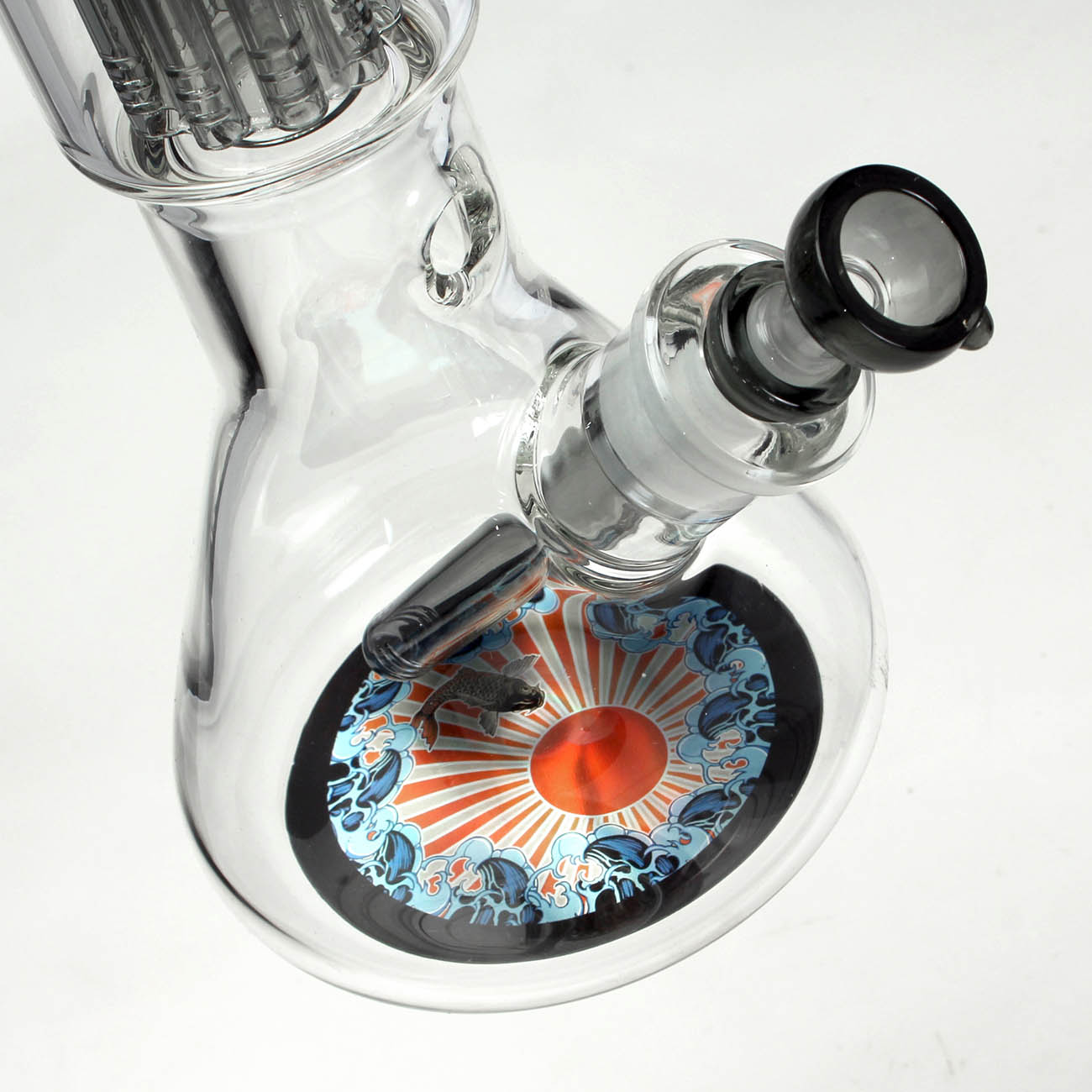 NOTE: The decoration of this bong was fired onto the bong by low-temperature film process. This is the only way to achieve this expressive color intensity of complex patterns and other design effects. However, these low-temperature decals are not scratch-resistant and require careful handling. Therefore, when cleaning, use only lukewarm water and do not allow sharp detergents to get to the outside. In general, there is a risk of peeling or damage with low-temperature decors.
