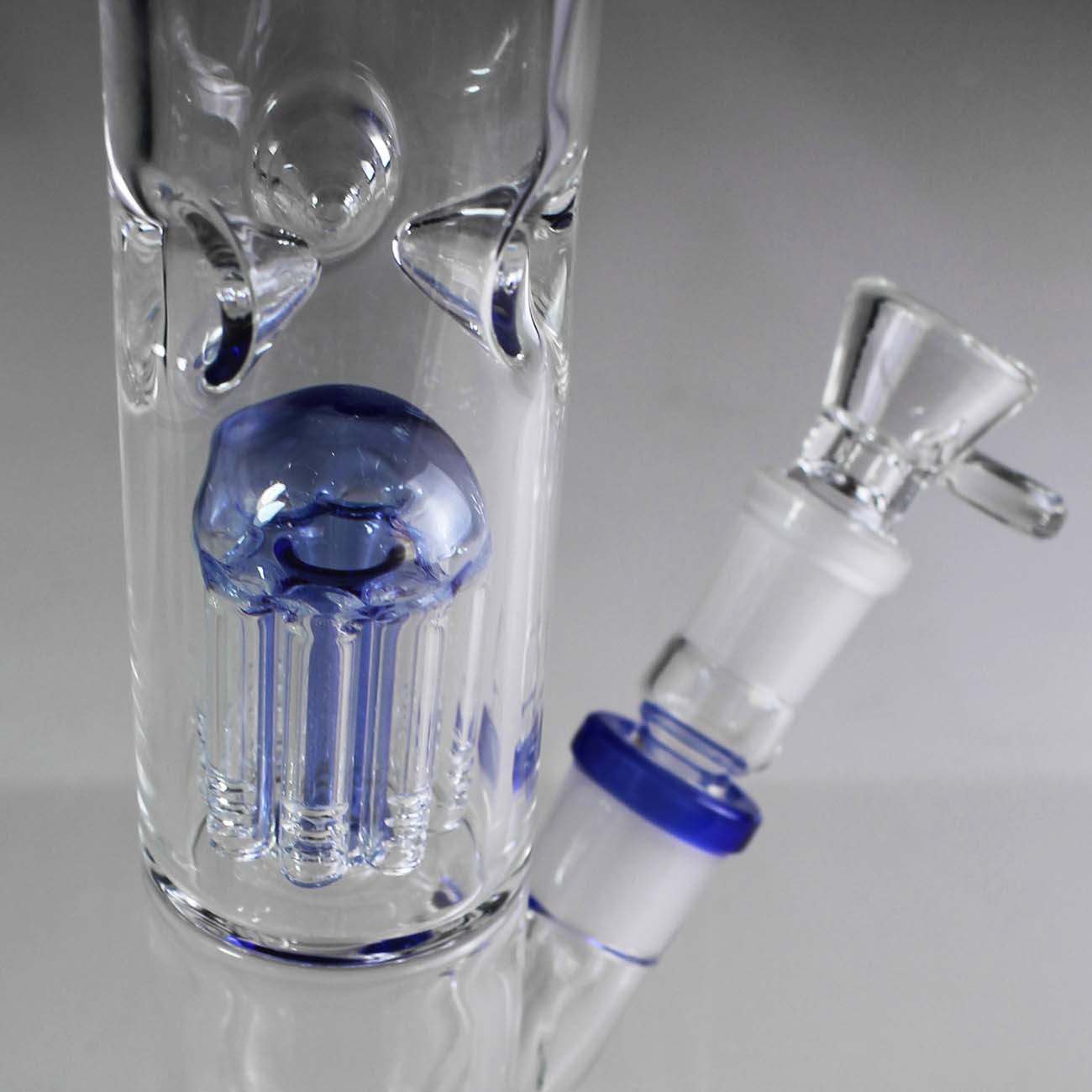 The percolator bong ensures efficient smoke cooling and filtering: diffuser slits in the chillum and the 8-arm tree percolator cause the water and smoke to swirl vigorously, ensuring effective cooling and smoke filtering. If you prefer it even cooler, simply fill ice cubes onto the ice notches.