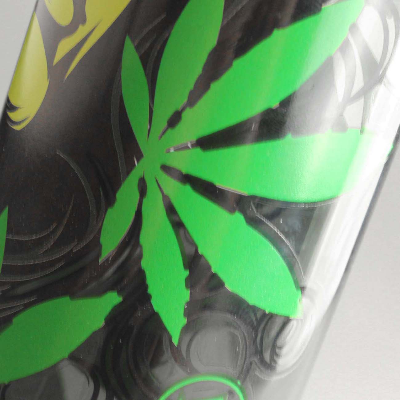 And here is the next strike of our FIRE-FLOW™ X Black Leaf® cooperation! Beautiful and noble grey glass beaker bong with a cool and funny motif of the famous CLIPPER® lighters. The design is fired onto the bong using a low-temperature film process. This creates incredible colour intensity, which looks extremely stylish on the black transparent bong. Please note: unfortunately, some of the hemp leaves on this design have been slightly unevenly burned. Therefore, this item is available at a small discount.This special bong is really eye-catching - and highly functional at the same time!