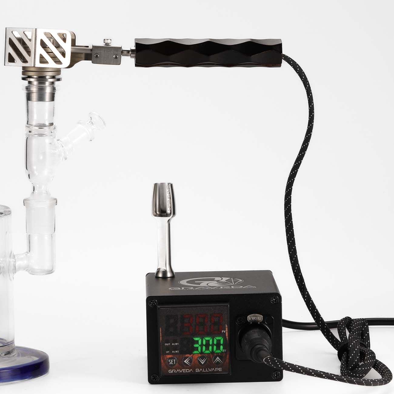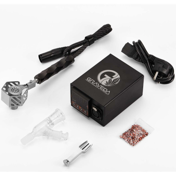 1pc GRAVEDA controller 1pc ball vape (terphammer) with titanium head 100pc rubies diamond cut 1pc glass bowl SG 14 1pc stainless steel shovel 1pc textile-coated cable 1pc stainless steel stand for cable 1pc manual