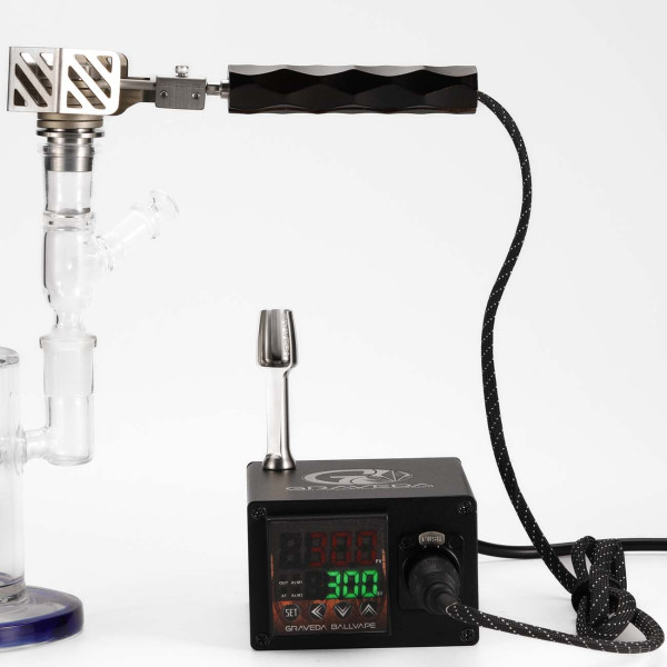 With the BALL-VAPE OG from GRAVEDA, you can transform a bong into a pure convection vapour station. First, the controller heats the titanium head of the terphammer, which is filled with faceted rubies, to the desired temperature. It is then placed on the glass bowl filled with herbs, hash or rosin, which in turn is inserted into a bong. When you take a drag on the bong, the heated air from the terphammer flows through the rubies and then through the herbs, causing vaporization through the heated air stream - in other words, convection vaporisation for the purest and most intense flavour.