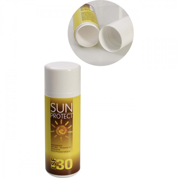 The interior is separated from the bottle opening by an insert so that the precious contents are not touched if a blot of real sun lotion is filled into the opening for better camouflage. The label is in German language.