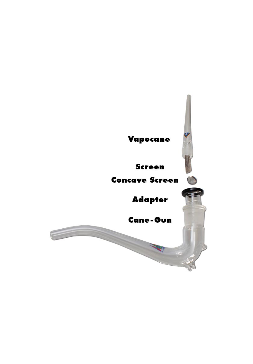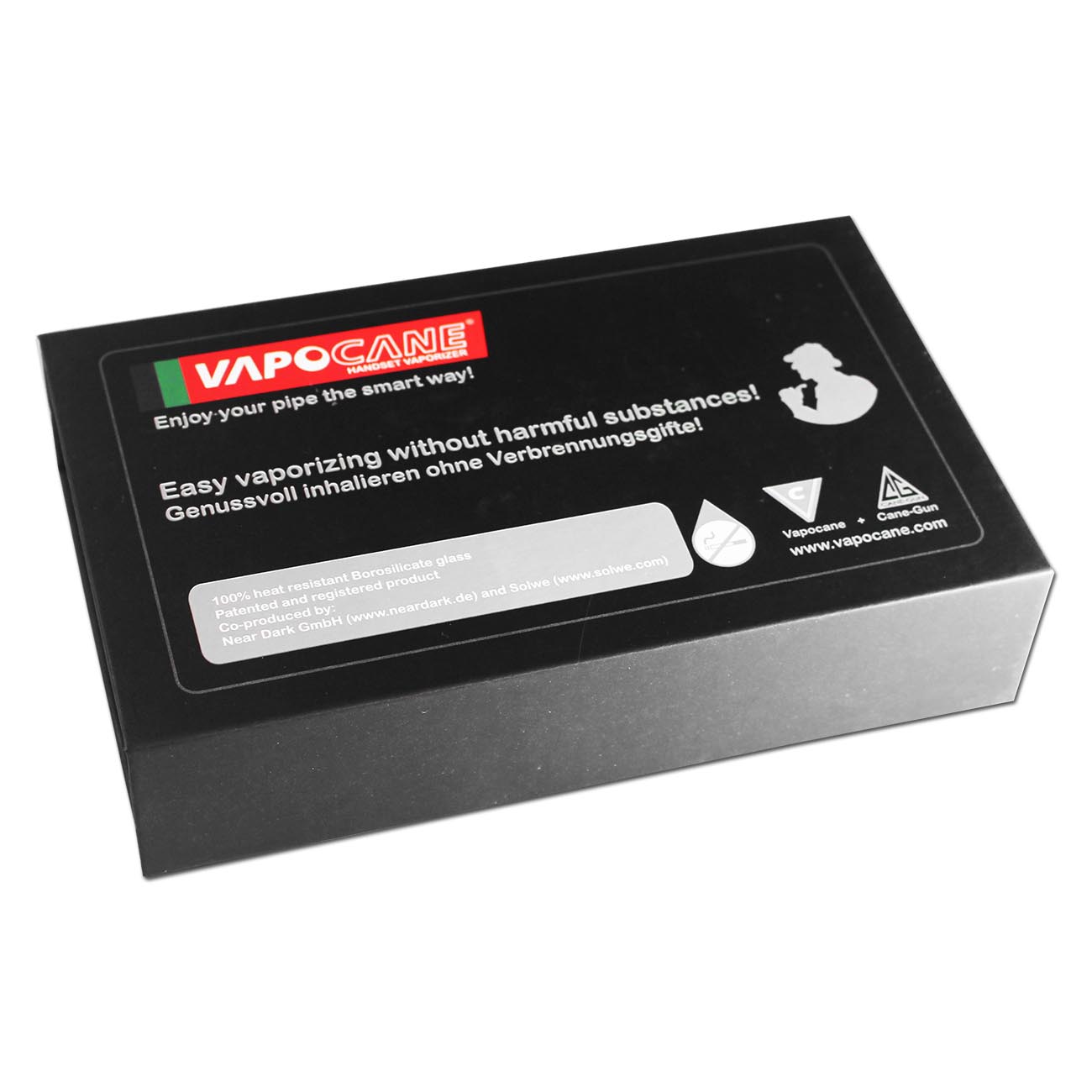 The Vapocane is a patented vaporizer attachment which fits on all glass bongs with 14,5mm standard grinding. It turns a glass pipe into an excellent vaporizer. You will consume only the really wanted substances of your herb mix. Instead of burning the plant and smoke it, a hot airstream passes the plant and you inhale the active components of the tobacco without burning it. The smoke with its numerous poisonous substances is avoided. The package contains a Vapocane, Cane-Gun glass pipe, an adapter with standard grinding 14,5/18,8mm, 5 arched steel filters of the brand Black Leaf for plants, 3 fine screens made of steel for resins and oils and a user manual in DE, EN, ES, FR, IT, RU, JA.