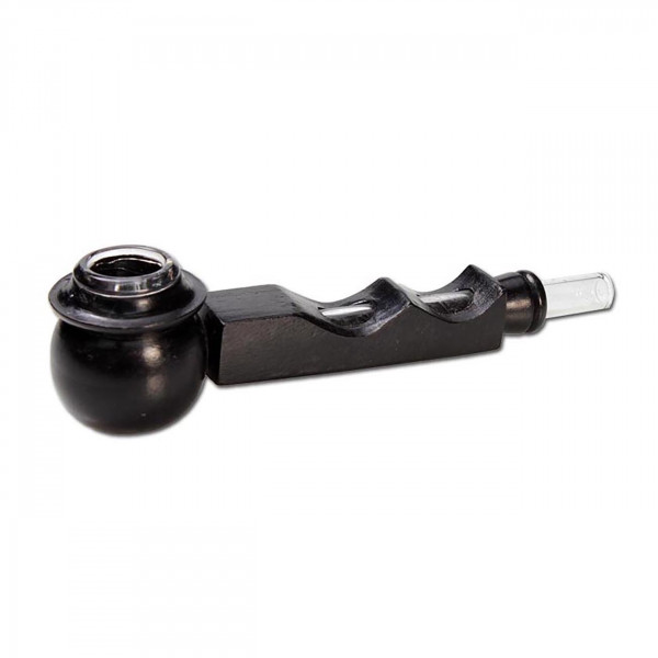 This wooden pipe has a glass bowl, a mouthpiece and a tube made of glass.